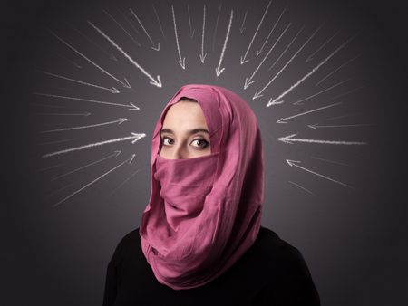 Young muslim woman wearing niqab with white arrows pointing to her head