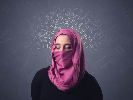 Young muslim woman wearing niqab with white alphabet letters above her head