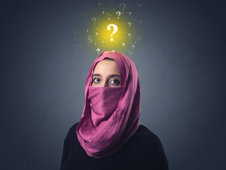 Young muslim woman wearing niqab with yellow question marks above her head