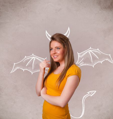 Young nasty girl with devil horns and wings drawing