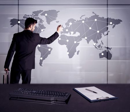 A young office worker drawing on world map and connecting dots with lines, presenting marketing sterategy at office environment concept