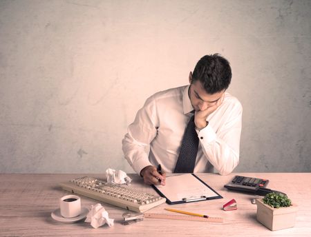 A young office worker sitting at desk working with keyboard, papers, highliter in front of empty clear background wall concept