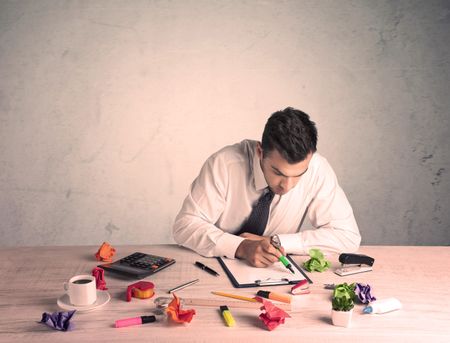 A young office worker sitting at desk working with keyboard, papers, highliter in front of empty clear background wall concept