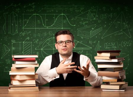 A young passionate male teacher sitting at school desk, reading a book, with area algorythm calculations and numbers on the blackboard concept.