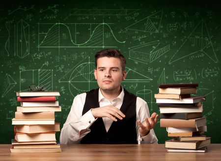 A young passionate male teacher sitting at school desk, reading a book, with area algorythm calculations and numbers on the blackboard concept.