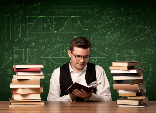 A young passionate male teacher sitting at school desk, reading a book, with area algorythm calculations and numbers on the blackboard concept.