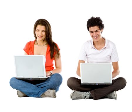 Young people sitting with laptop computers - isolated over white