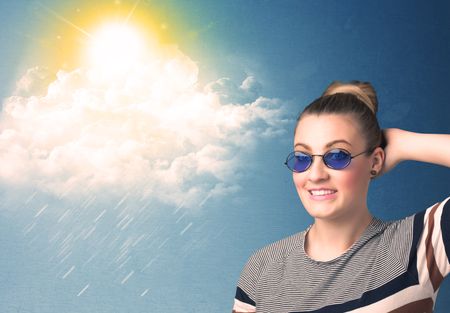 Young person looking with sunglasses at clouds and sun concept on blue background