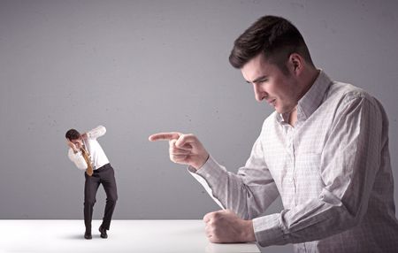Young professional businessman being angry with an other miniature businessman in front of a splattered background