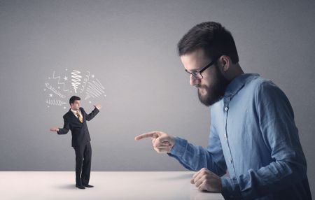 Young professional businessman being angry with an other miniature businessman who has scribbles above his head