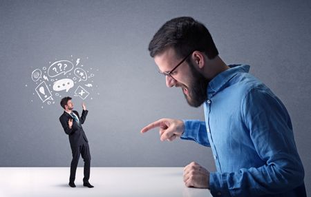 Young professional businessman being angry with an other miniature businessman who has drawn speech and thought bubbles above his head