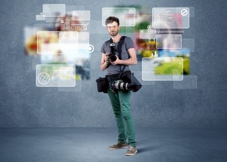 A young professional male photographer holding cameras and taking pictures in front of a blue wall with pictures, icons, text information concept