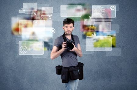A young professional male photographer holding cameras and taking pictures in front of a blue wall with pictures, icons, text information concept