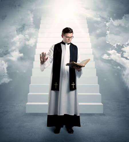 A young religious happy priest standing in front of the stairway to heaven concept with clouds and bright lights coming from above.