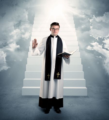 A young religious happy priest standing in front of the stairway to heaven concept with clouds and bright lights coming from above.