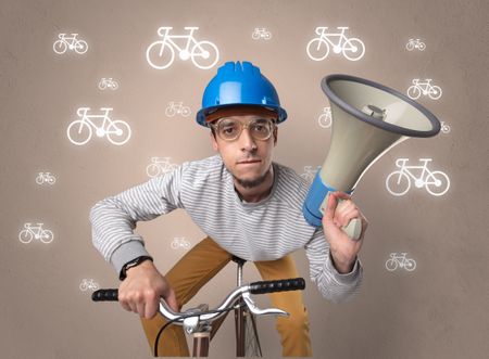 Young ridiculous biker with line drawn bikes on the background