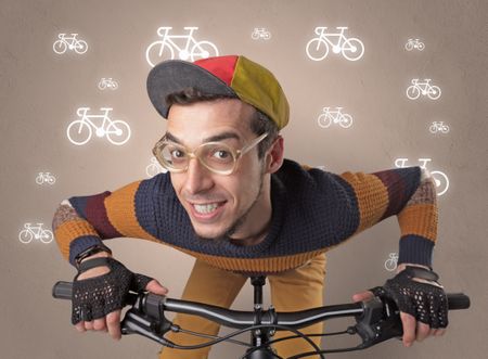 Young ridiculous biker with line drawn bikes on the background