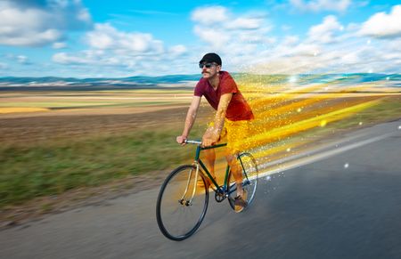 Young riding bicycle in fabulous nature with high speed