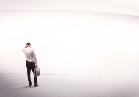 Young sales business male in elegant suit standing with his back in empty white space background with lines concept