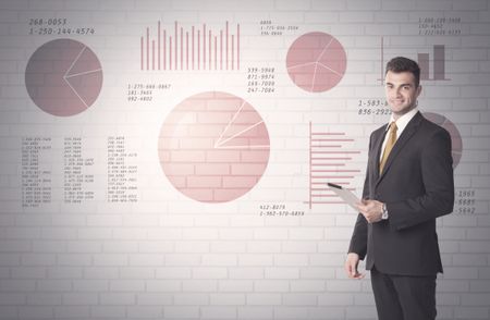 Young sales business male in elegant suit standing in front of brick wall background with lines and pie charts concept
