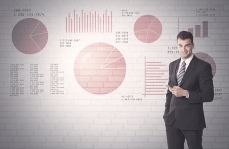 Young sales business male in elegant suit standing in front of brick wall background with lines and pie charts concept