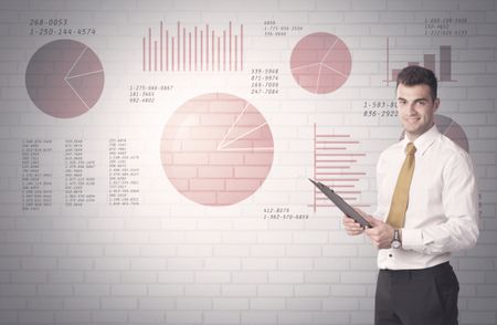 Young sales business male in elegant suit standing in front of brick wall background with lines and pie charts concept