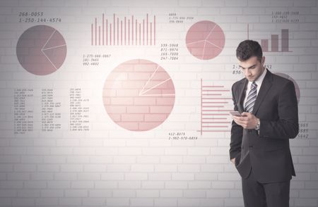 Young sales business male in elegant suit standing in front of brick wall background with lines and pie charts concept