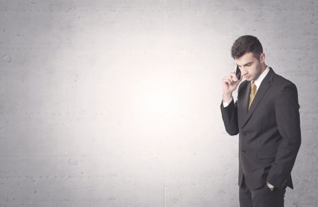 Young sales business person in elegant suit standing in front of clear empty grey wall background while talking on the phone