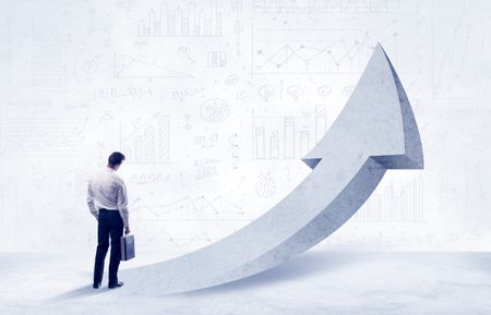 Young sales business person in elegant suit standing with his back in front of a big arrow pointing up and a clear background full of pie charts, numbers