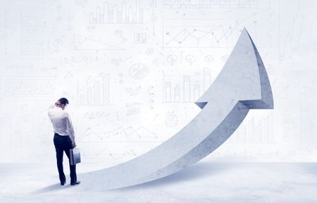 Young sales business person in elegant suit standing with his back in front of a big arrow pointing up and a clear background full of pie charts, numbers