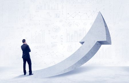 Young sales business person in elegant suit standing with his back in front of a big arrow pointing up and a clear background full of pie charts, numbers