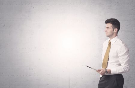 Young sales business person in elegant suit standing in front of clear empty grey wall background while talking on the phone