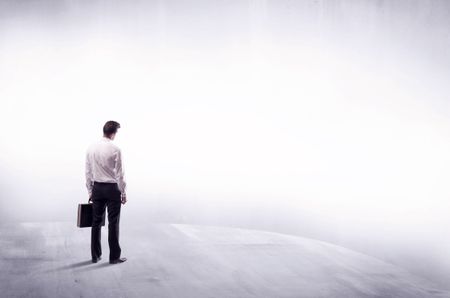 Young sales businessman in elegant suit standing with his back in empty white space background concept