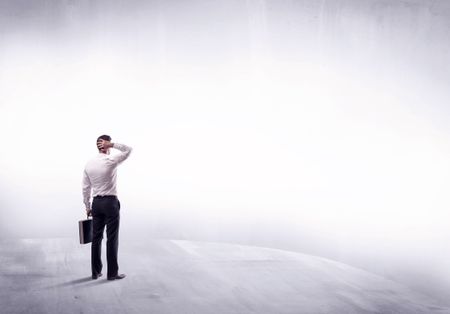 Young sales businessman in elegant suit standing with his back in empty white space background concept