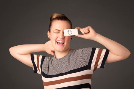 Young silly girl looking with hand drawn eye balls on paper concept