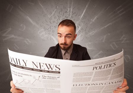 Young smart businessman reading daily newspaper with alphabet letters above his head