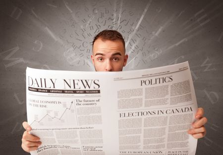 Young smart businessman reading daily newspaper with alphabet letters above his head