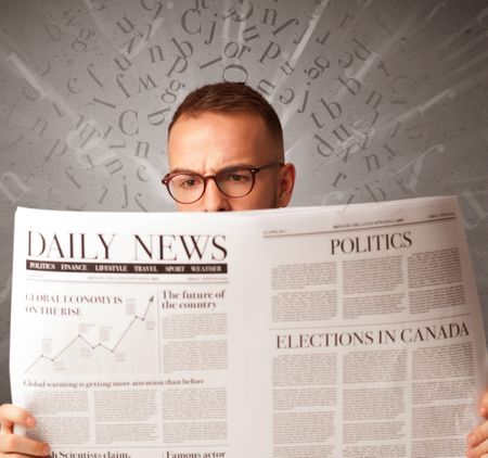 Young smart businessman reading daily newspaper with alphabet letters above his head