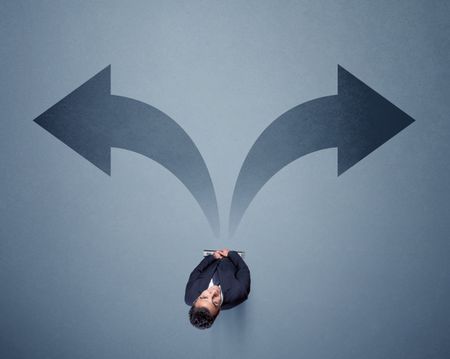 Young smart businessman standing in front of two arrows potinting to different ways contemplating a decision