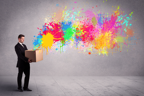A young smiling business male holding a paperboard box with illustration of colourful spray paint splash on urban wall background concept.