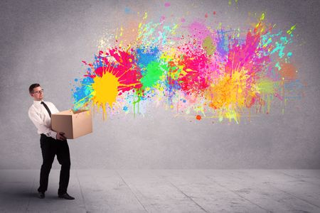 A young smiling business male holding a paperboard box with illustration of colourful spray paint splash on urban wall background concept.