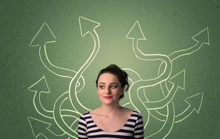 Young student with thoughtful expression with tangled arrows coming out of her back