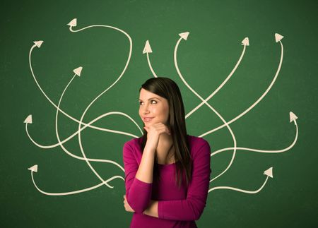 Young student with thoughtful expression with tangled arrows coming out of her back
