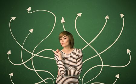 Young student with thoughtful expression with tangled arrows coming out of her back