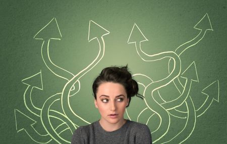 Young student with thoughtful expression with tangled arrows coming out of her back