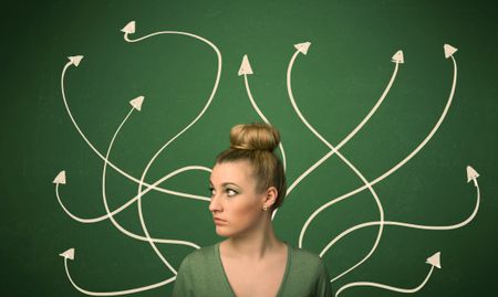 Young student with thoughtful expression with tangled arrows coming out of her back