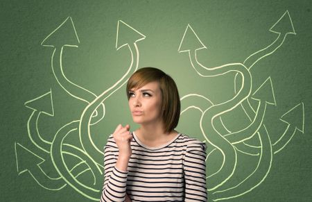 Young student with thoughtful expression with tangled arrows coming out of her back