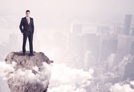 A young successful happy businessman standing confident on stone cliff in the clouds looking at the city scape from above concept