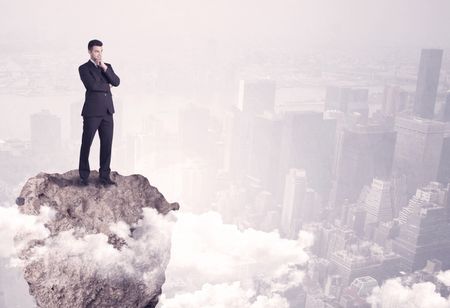 A young successful happy businessman standing confident on stone cliff in the clouds looking at the city scape from above concept