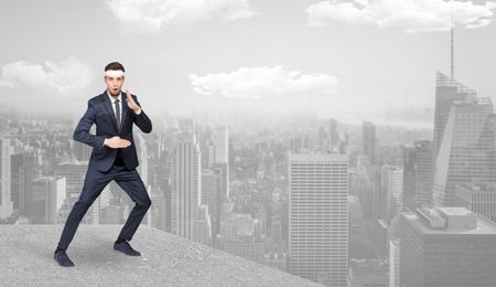 Young suited karate trainer doing karate tricks on the top of a metropolitan city